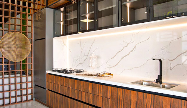 Nossa marmoraria própria permite a integração perfeita entre móveis planejados e pedras, eliminando a necessidade de ajustes posteriores. Isso garante um resultado final harmonioso e de alta qualidade.